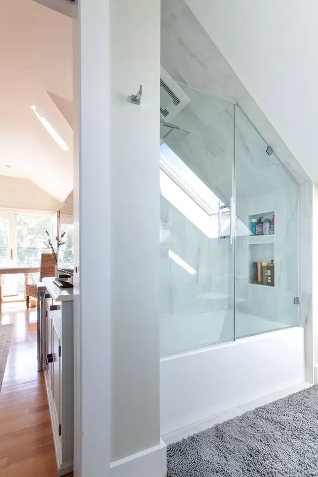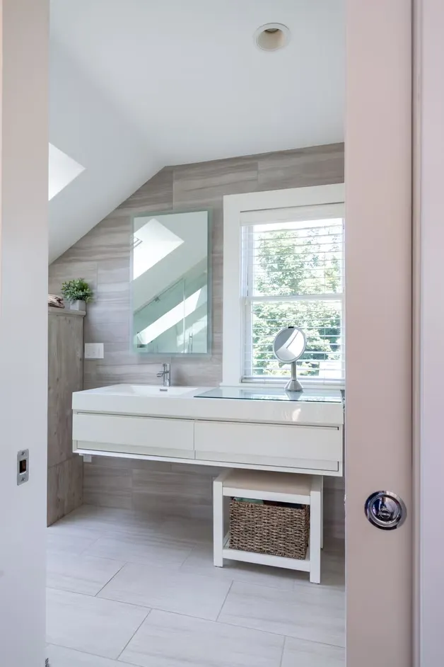 Located on the third floor of a charming Gloucester home, the Cahil Master Bathroom Remodel combines precision craftsmanship with modern luxury.