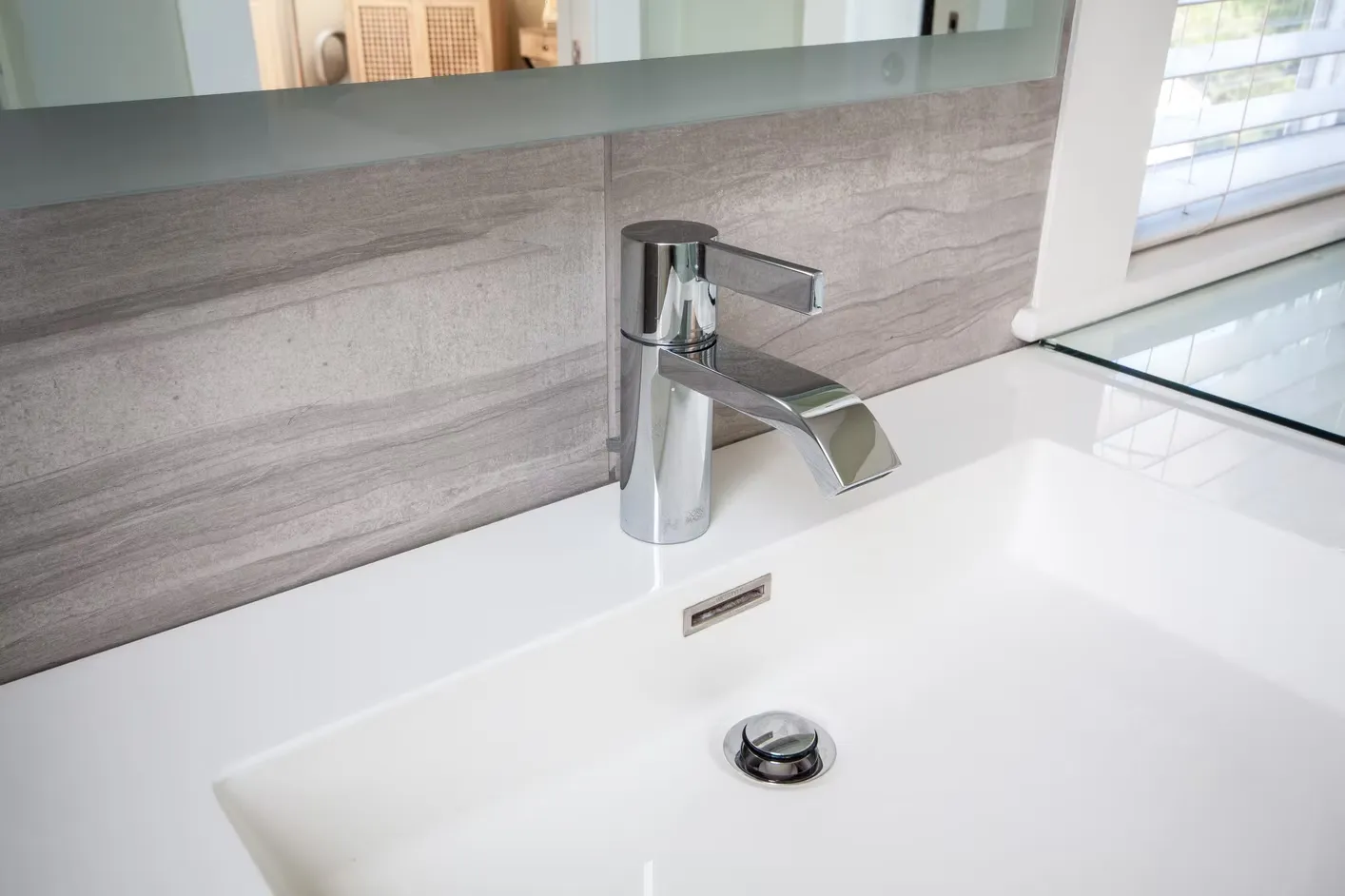 - Fixtures were installed with concealed plumbing for a minimalist, clean look.