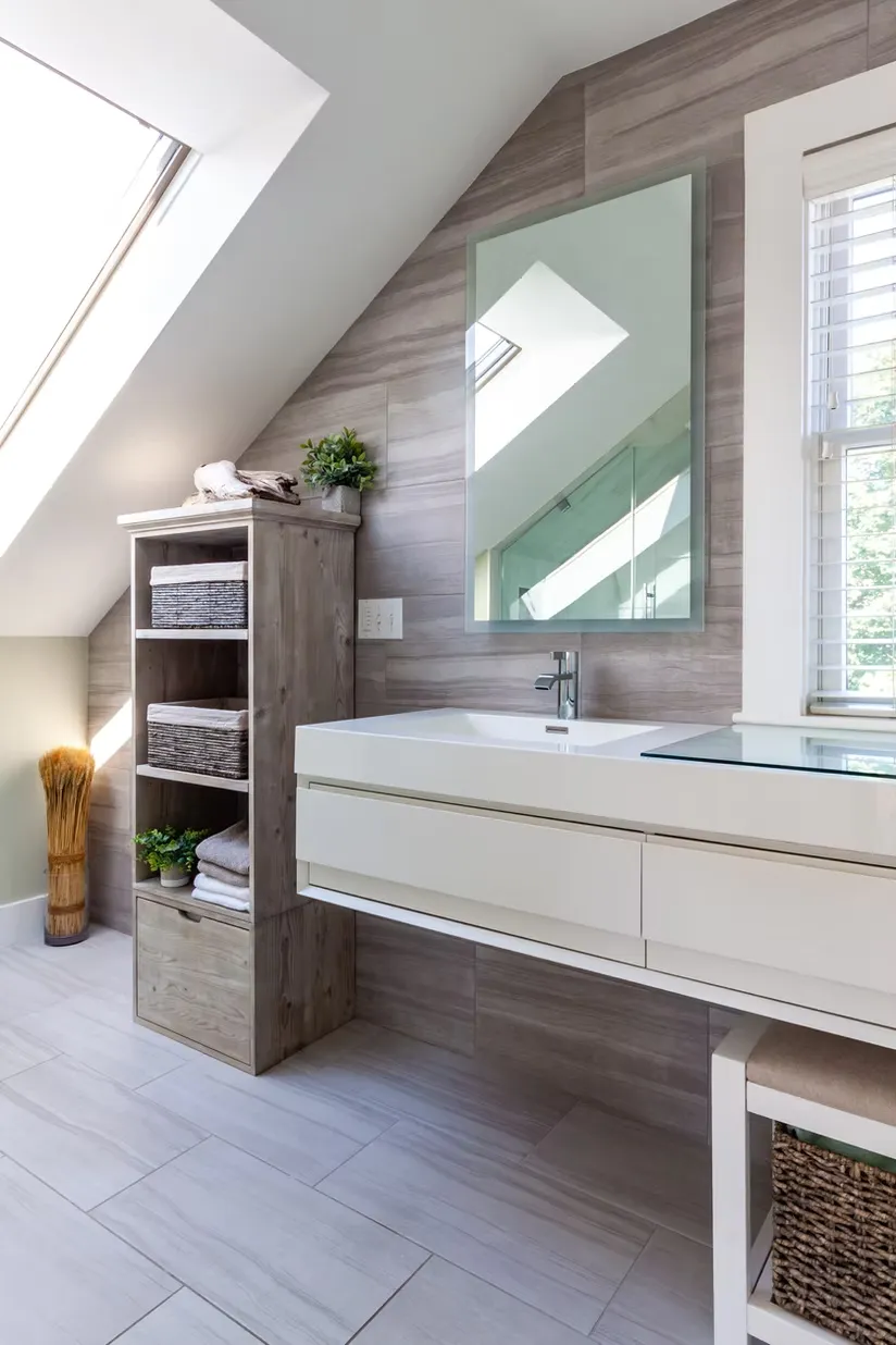 - Material Contrast: Matte porcelain tile paired with high-gloss vanity finishes