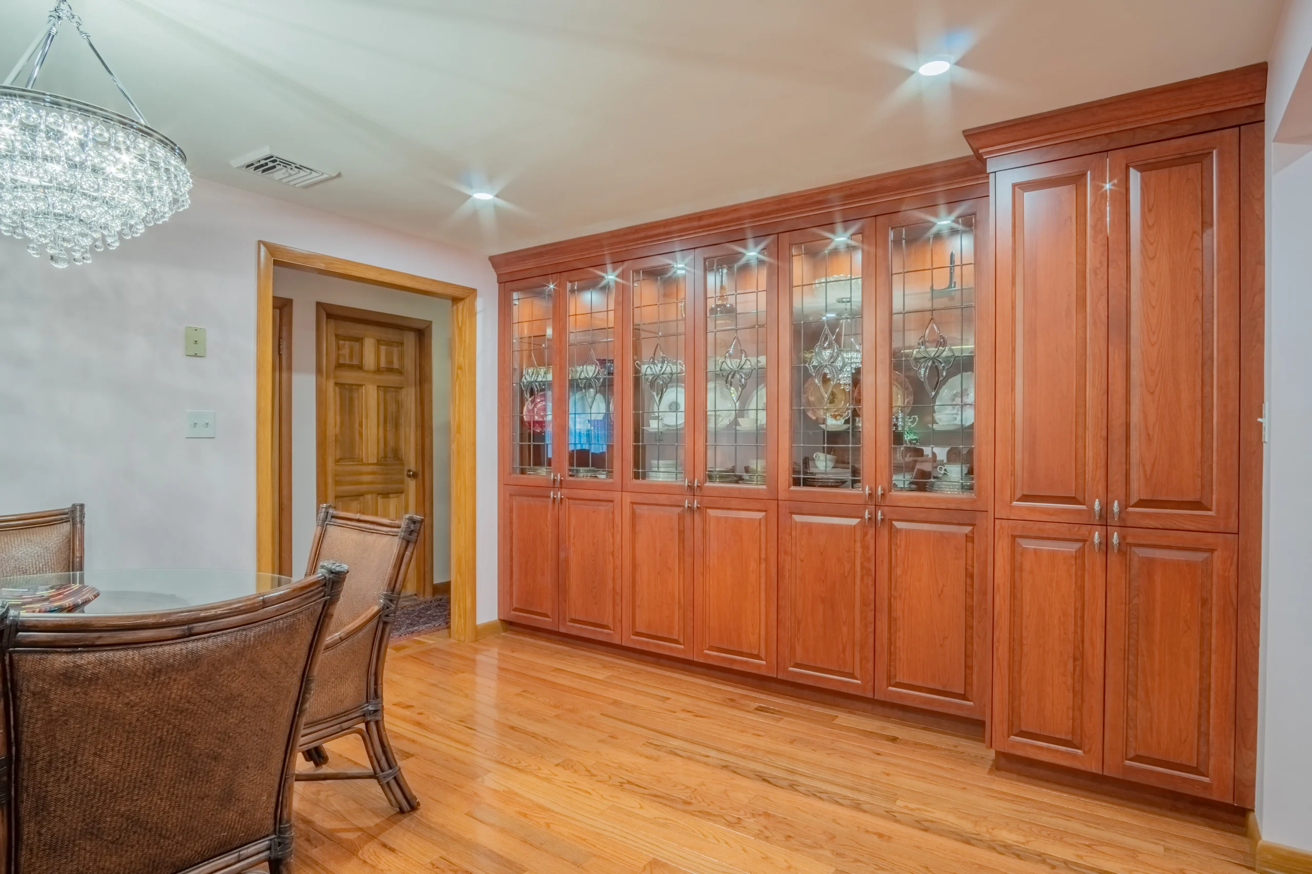 - Architectural Detailing – Custom millwork columns inspired by Athenian design, matched with crown molding and arched transoms.
