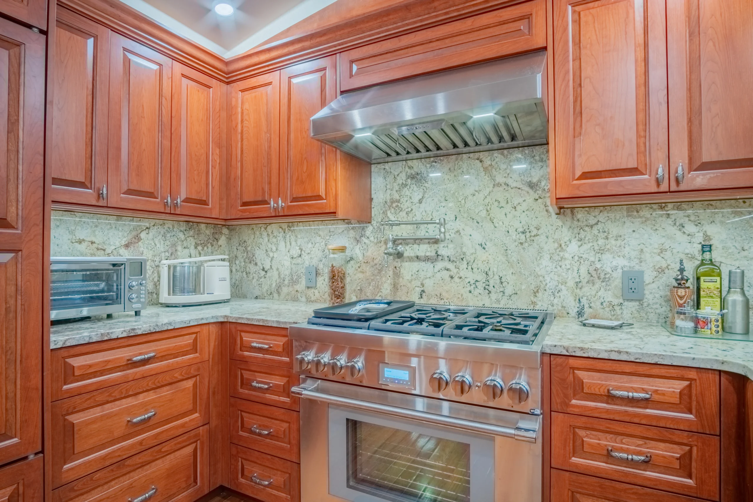 - Integrated Appliances – Panel-ready Sub-Zero refrigerator, Wolf range, and Cove dishwasher for a seamless aesthetic.