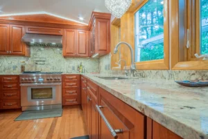 - Stonework & Countertops – Imported Italian Calacatta quartzite countertops with a waterfall edge on the island.